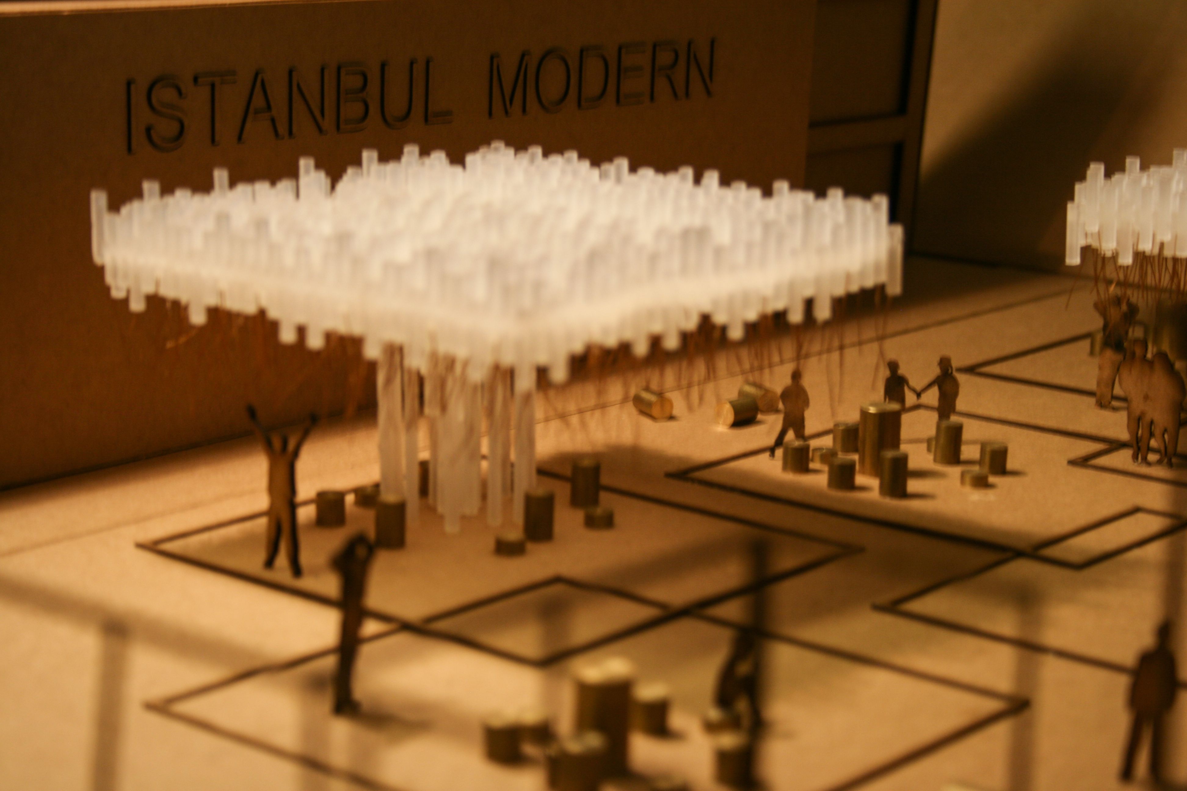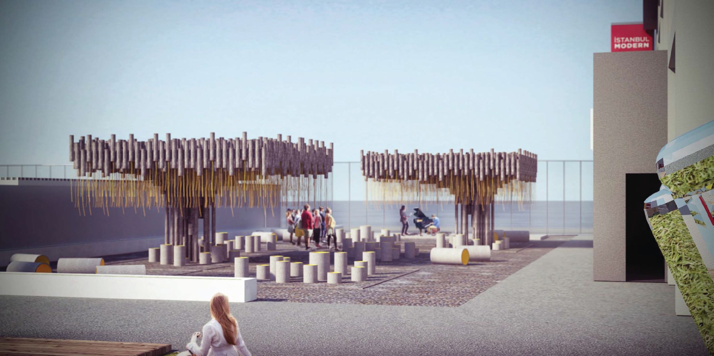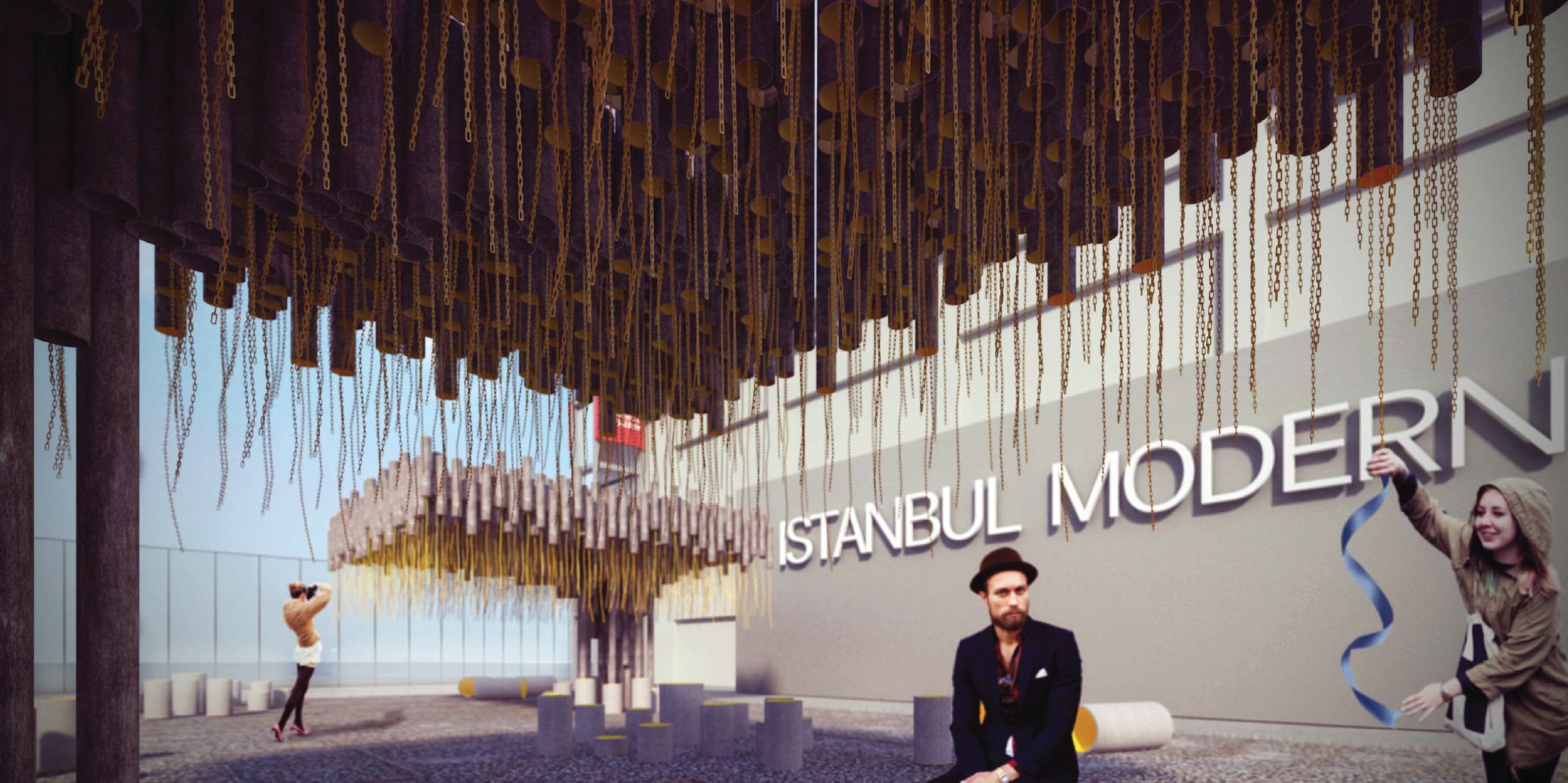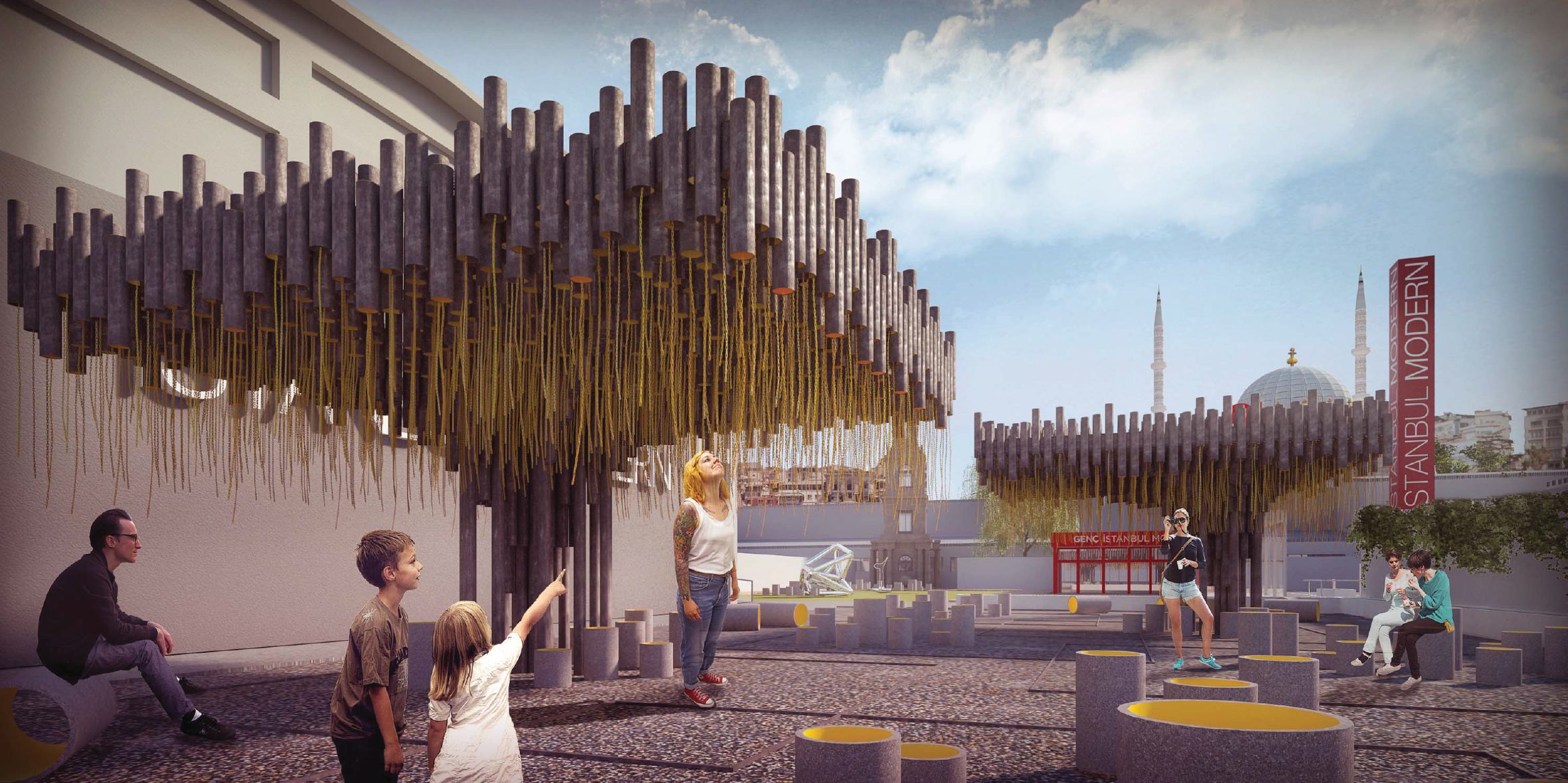 “Whisper of Trees” evokes nature—to which we have not been paying heed for a long time—calling out to us anew. Composed of raw metal pipes and chains that hang from inside them, the design embodies the metaphor of the wishing tree. Pipes represent every tree that has been killed. With the aid of the sea breeze, the dangling chains start moving and producing sounds. Touching Istanbul Modern’s courtyard only at two points, the design provides shaded areas and allows the space to be used in different ways.