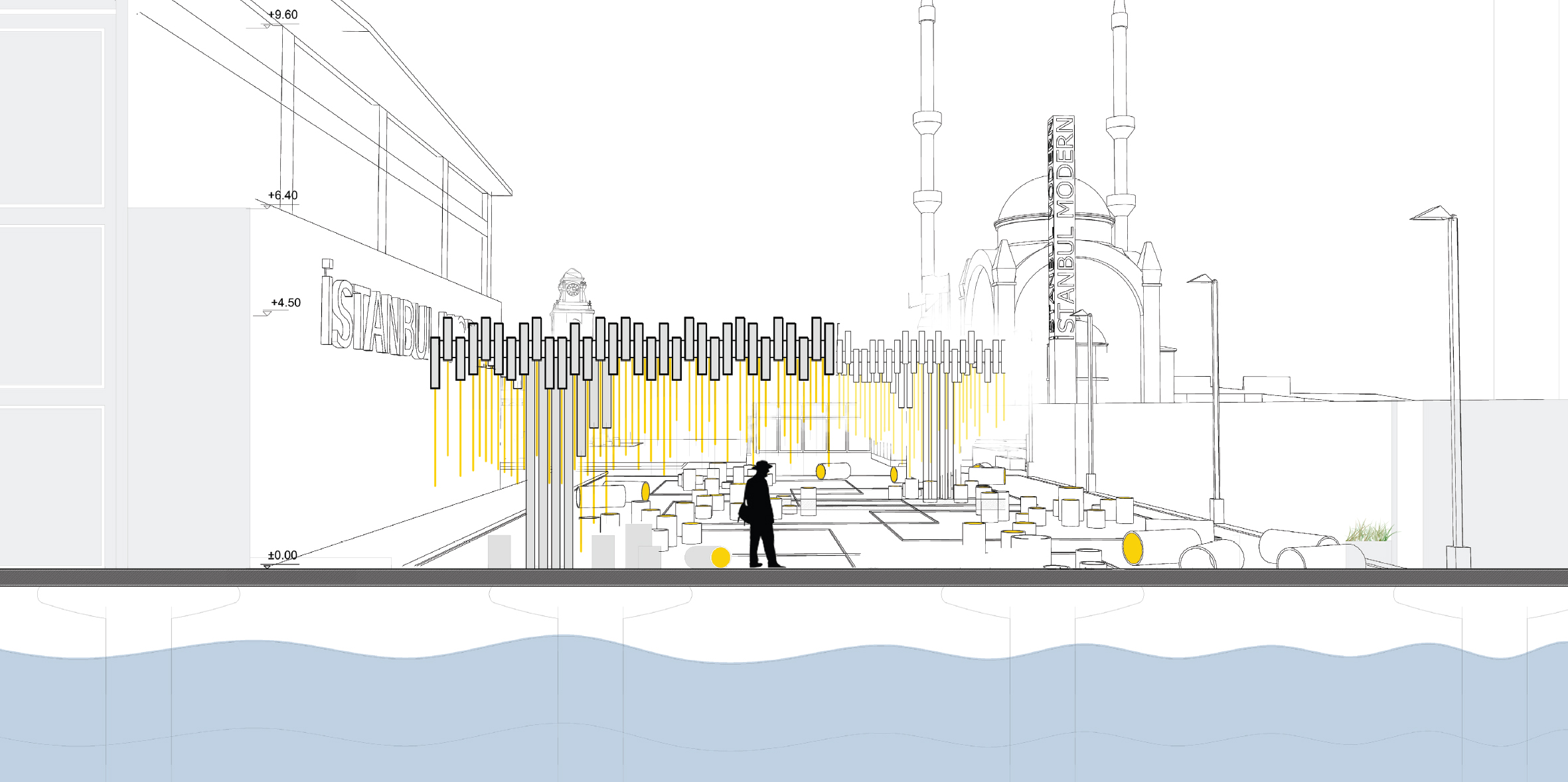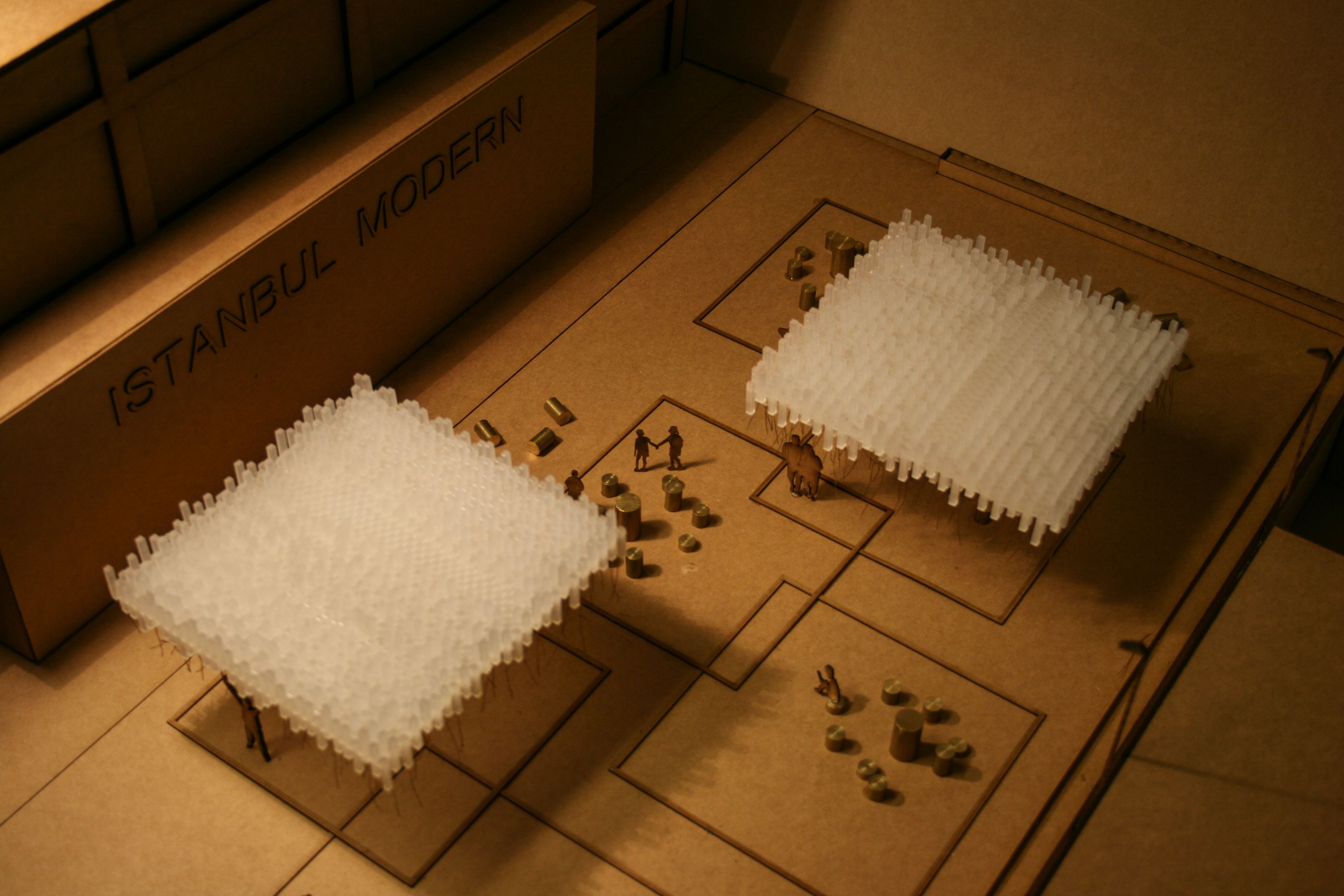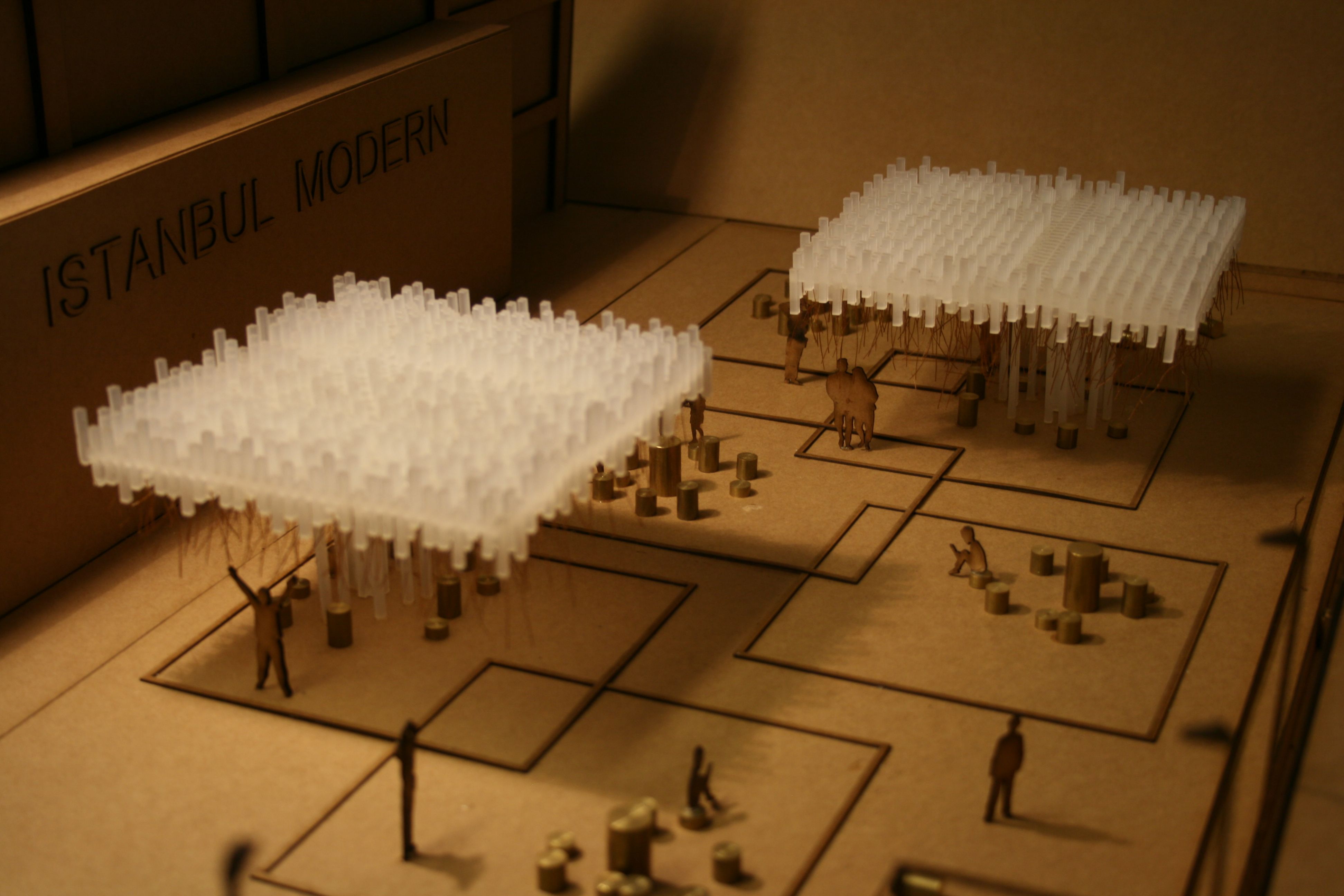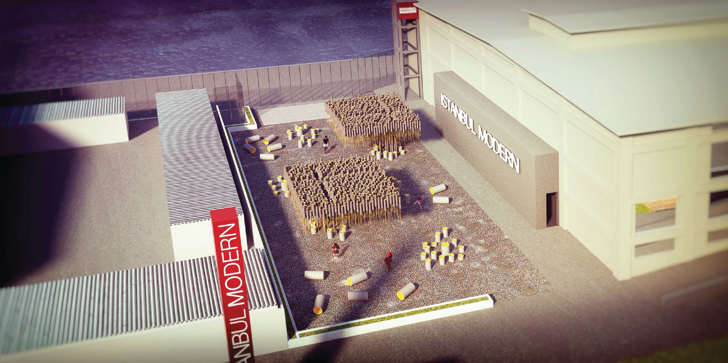 “Whisper of Trees” evokes nature—to which we have not been paying heed for a long time—calling out to us anew. Composed of raw metal pipes and chains that hang from inside them, the design embodies the metaphor of the wishing tree. Pipes represent every tree that has been killed. With the aid of the sea breeze, the dangling chains start moving and producing sounds. Touching Istanbul Modern’s courtyard only at two points, the design provides shaded areas and allows the space to be used in different ways.