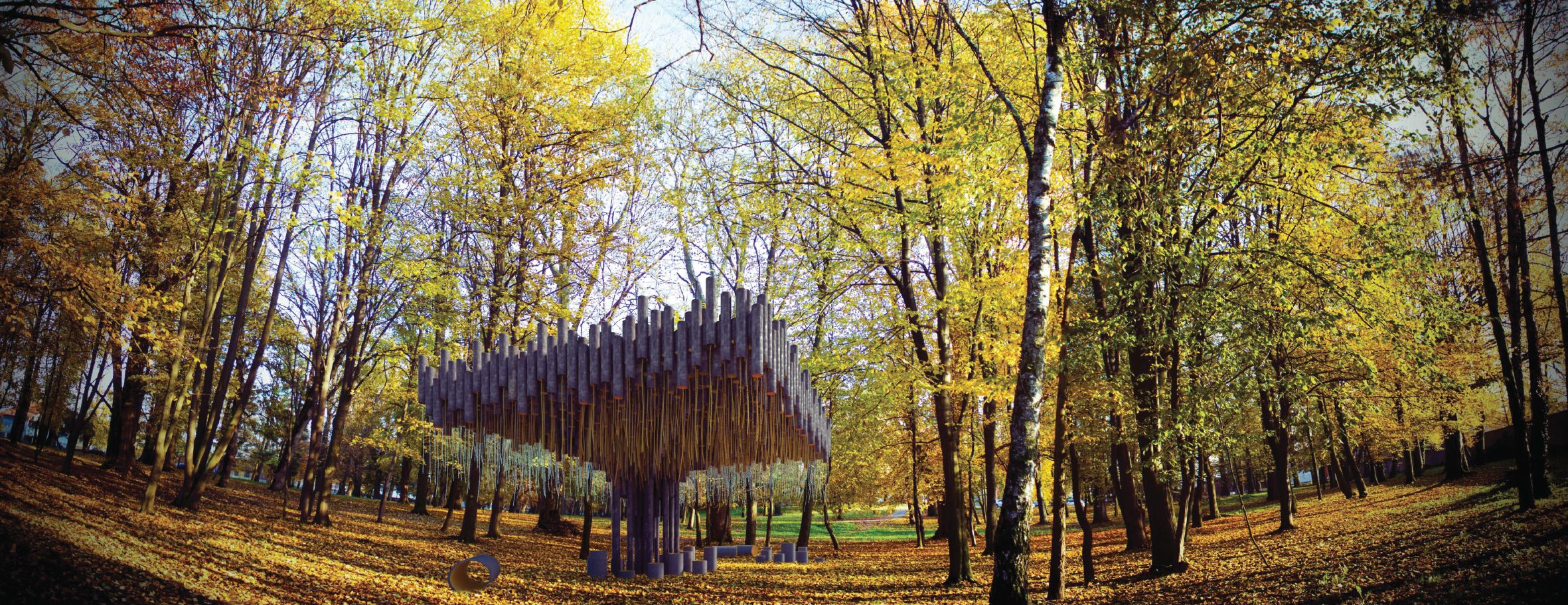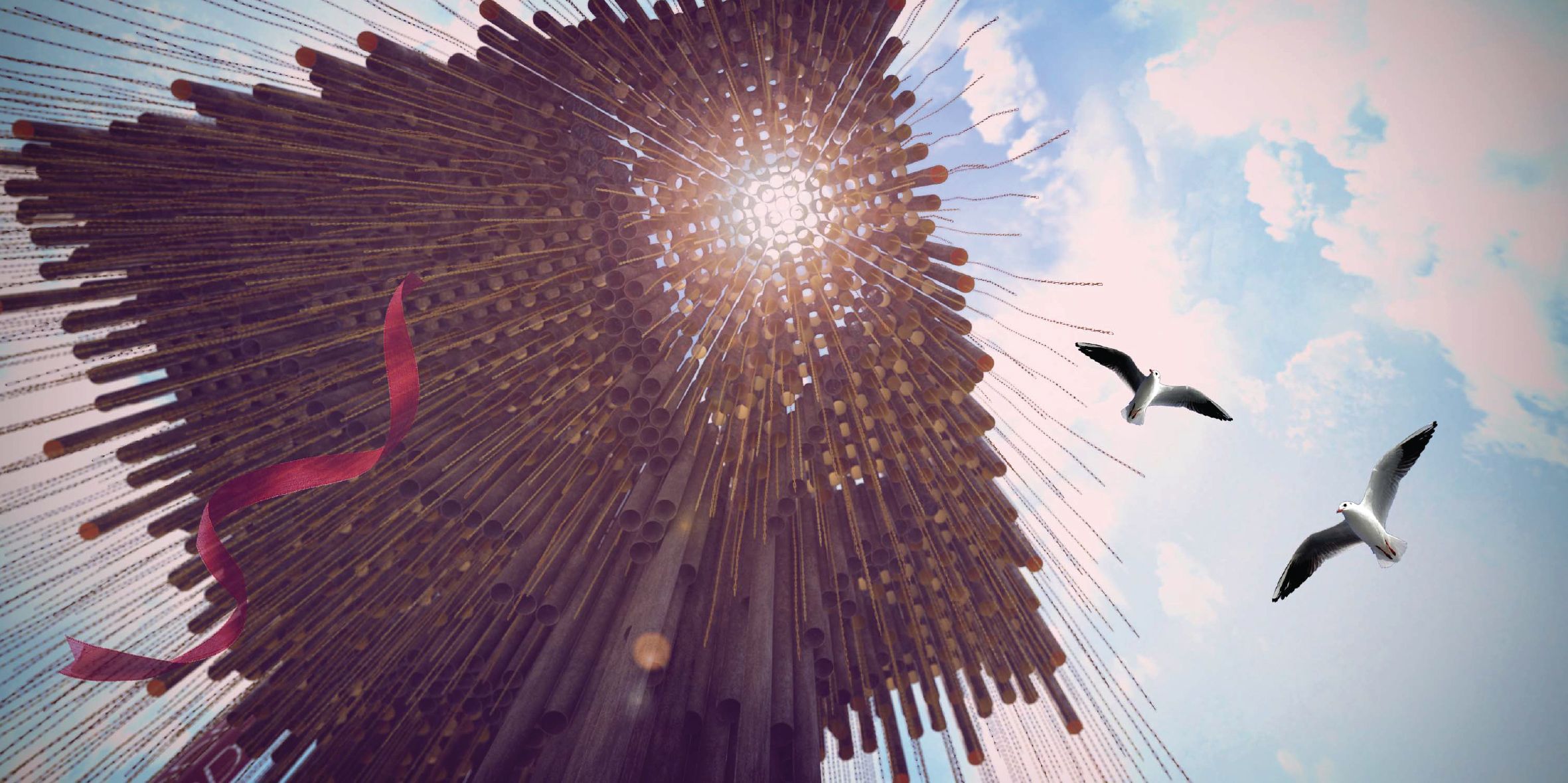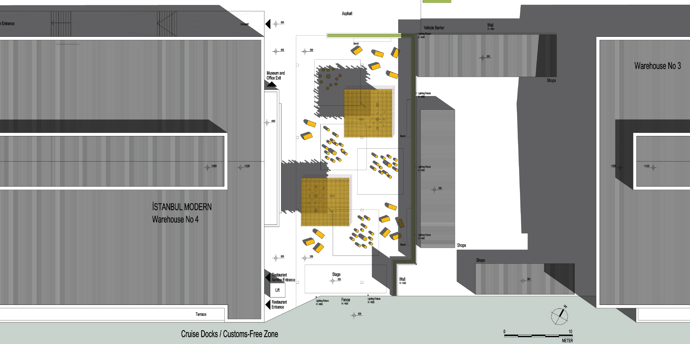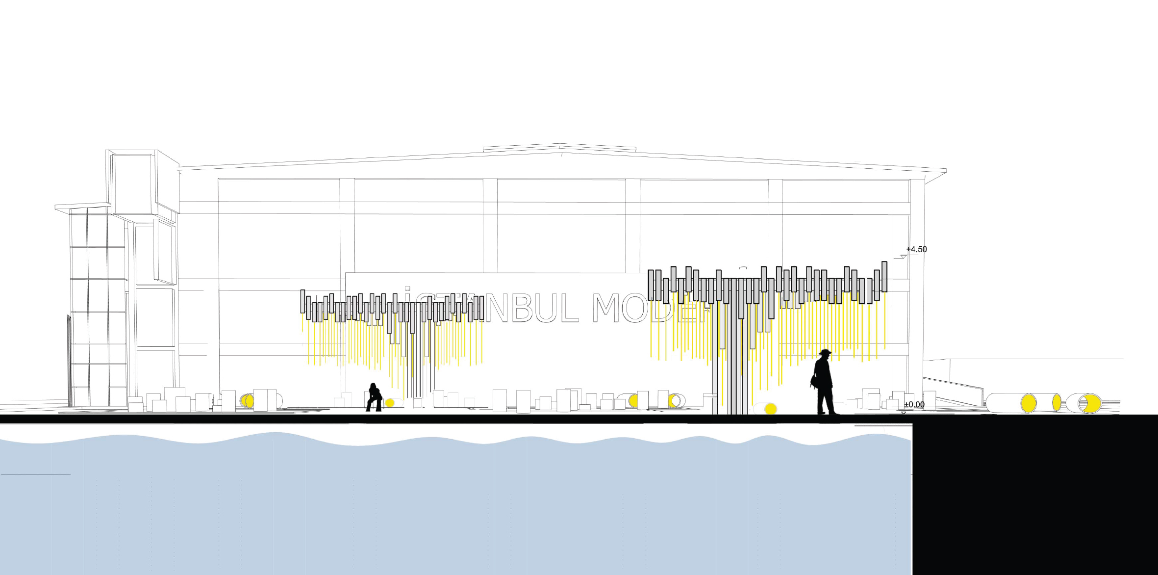 “Whisper of Trees” evokes nature—to which we have not been paying heed for a long time—calling out to us anew. Composed of raw metal pipes and chains that hang from inside them, the design embodies the metaphor of the wishing tree. Pipes represent every tree that has been killed. With the aid of the sea breeze, the dangling chains start moving and producing sounds. Touching Istanbul Modern’s courtyard only at two points, the design provides shaded areas and allows the space to be used in different ways.