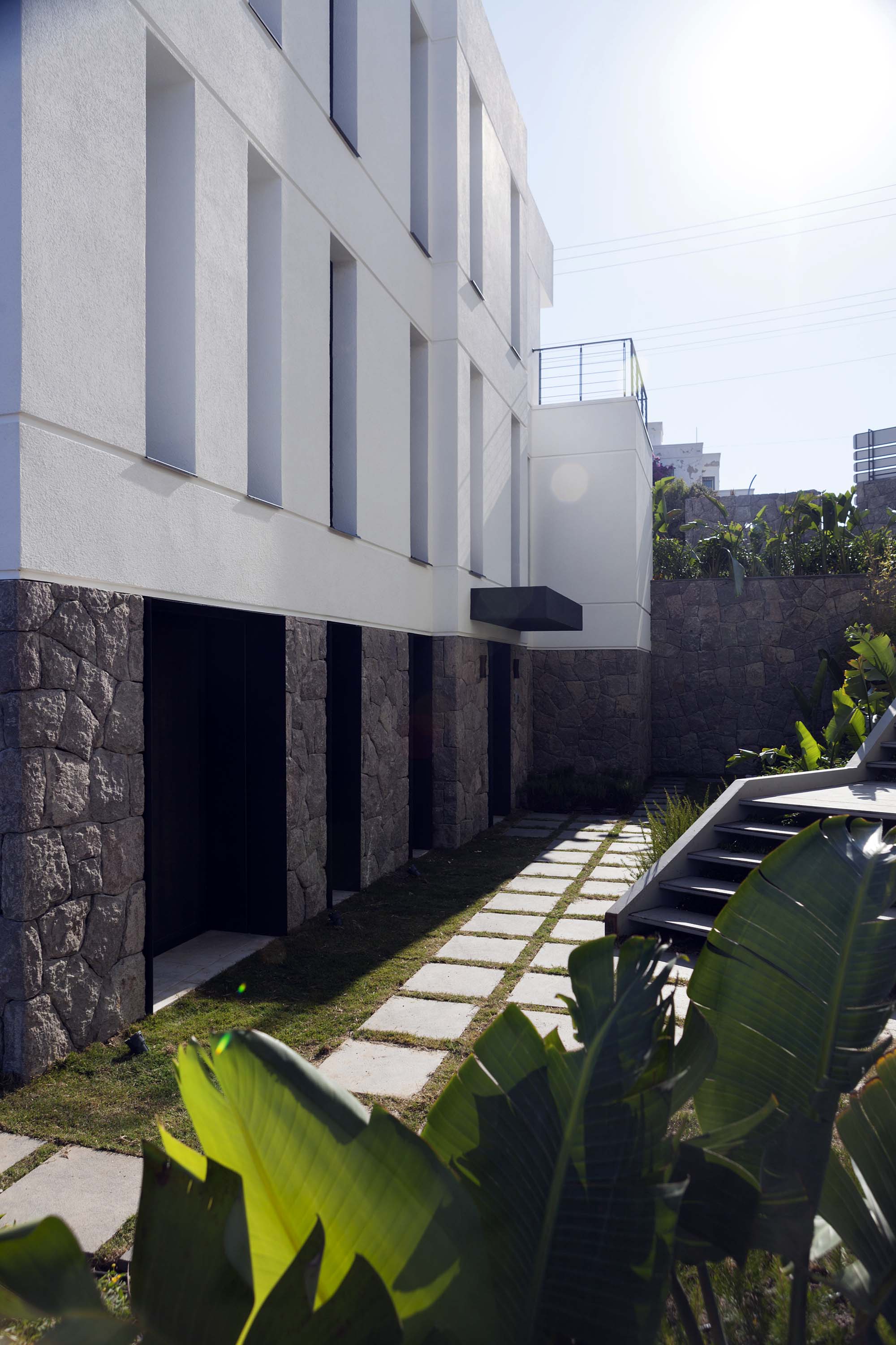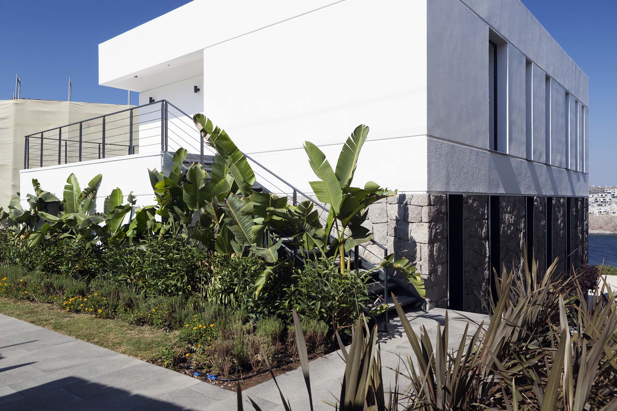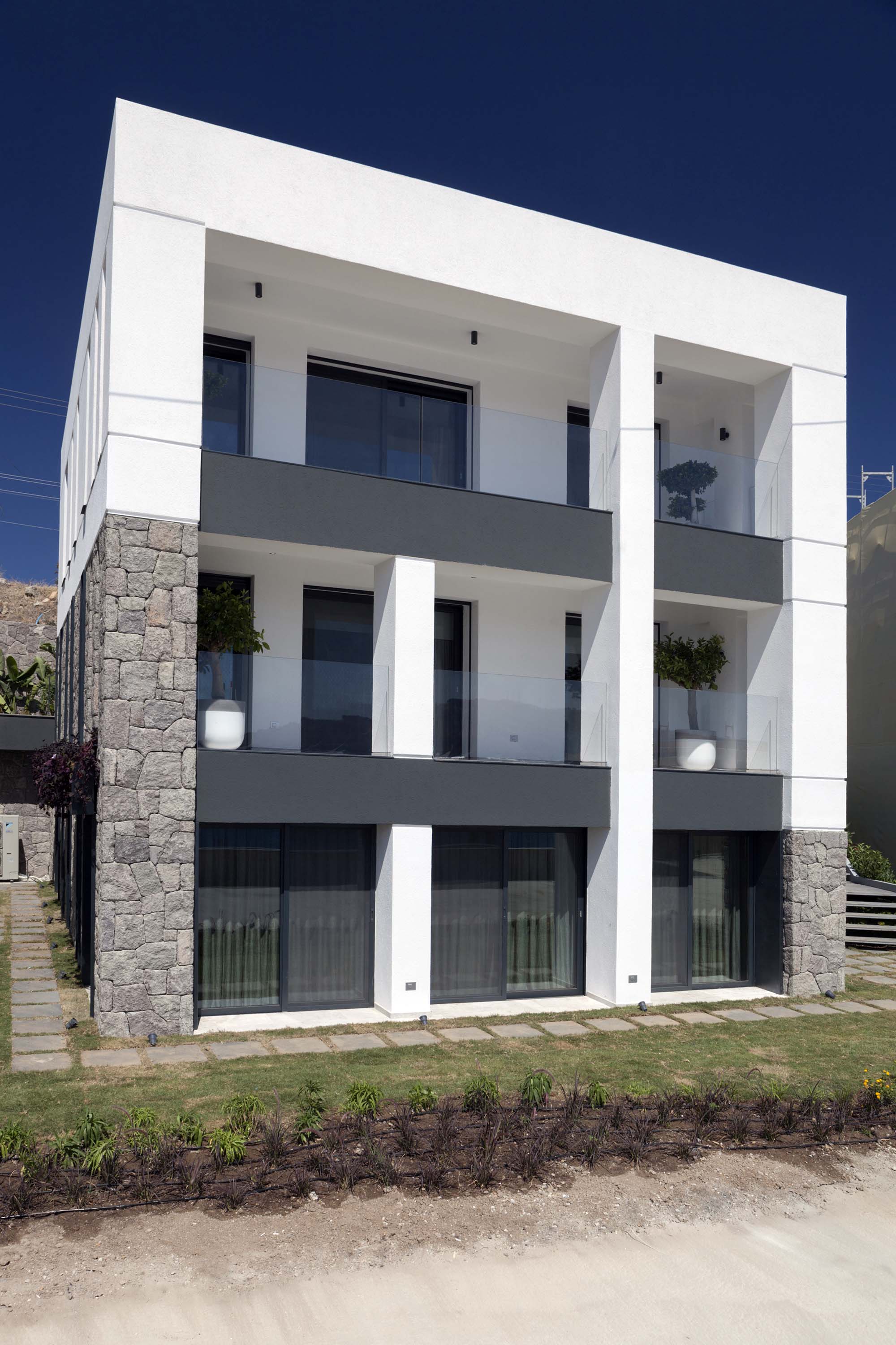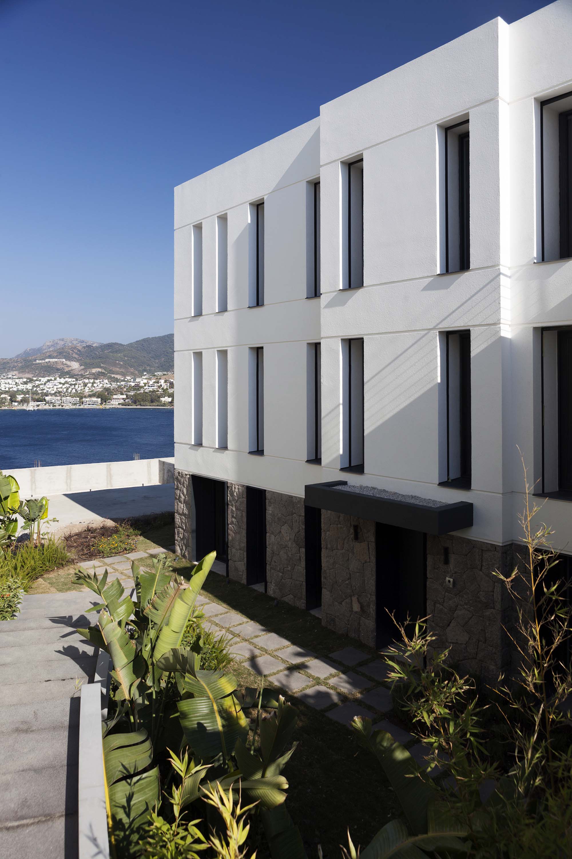 The project, consisting of 13 buildings and 4 different types of housing, has ensured all the villas to have a unique view of the bay, by utilizing the vertical form of the land extending from the sea towards the slope. The design, remaining true to Bodrum’s well-known white colored architectural texture while skillfully applying Bodrum’s natural stones, has been constructed in cubic form structures in order to get the most out of the land. An additional feature of the design was to form a bond with the surrounding nature by restricting the use of natural stones solely in the base level and thus obtaining a two storey appearance of the three storey buildings. While achieving the widest possible uninterrupted view of the landscape through large openings in the front façades, narrow and long glass openings on the side façades are planned to break the mass effect of the cubic structure. At the same time, shadow variations of the different hours of the day were moved to the interior.