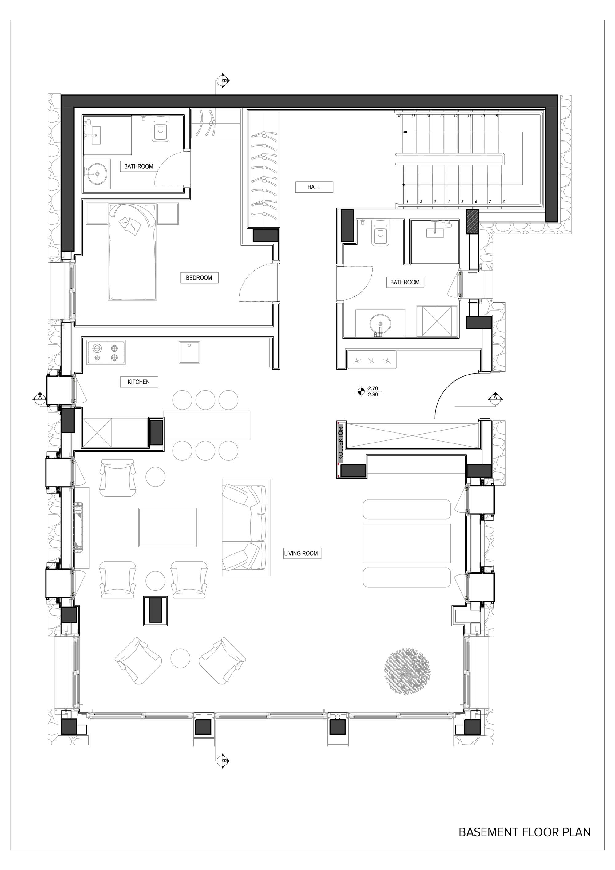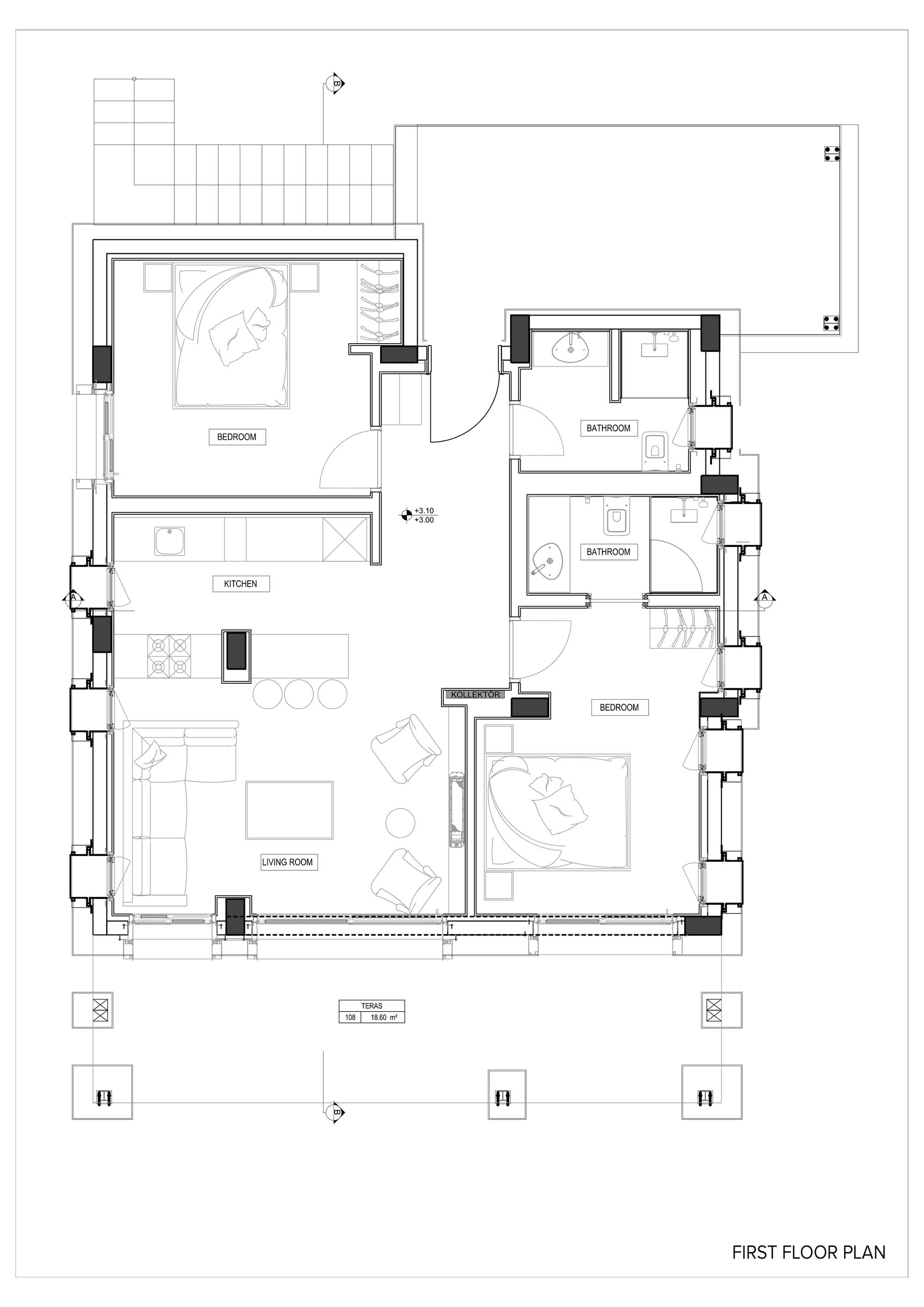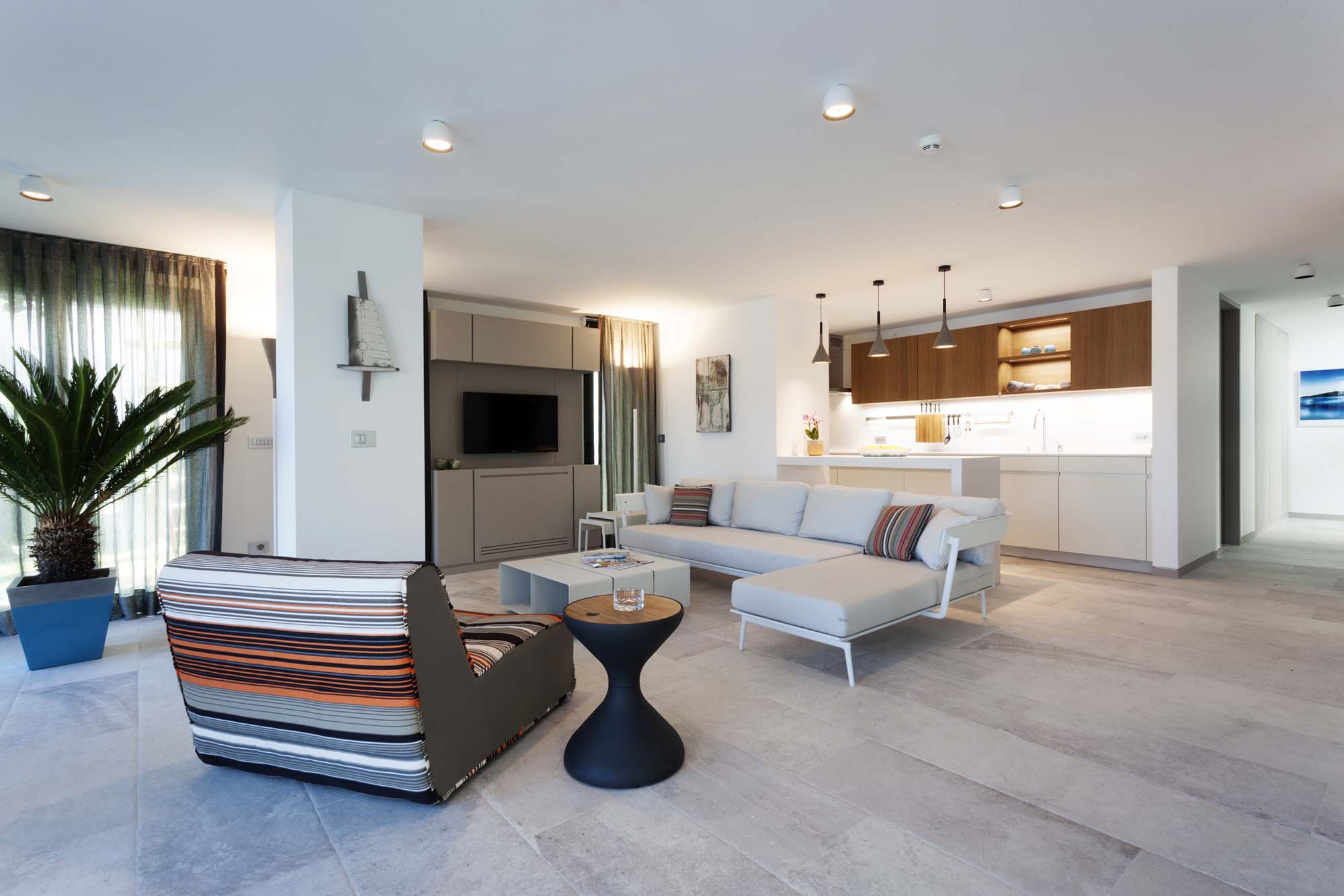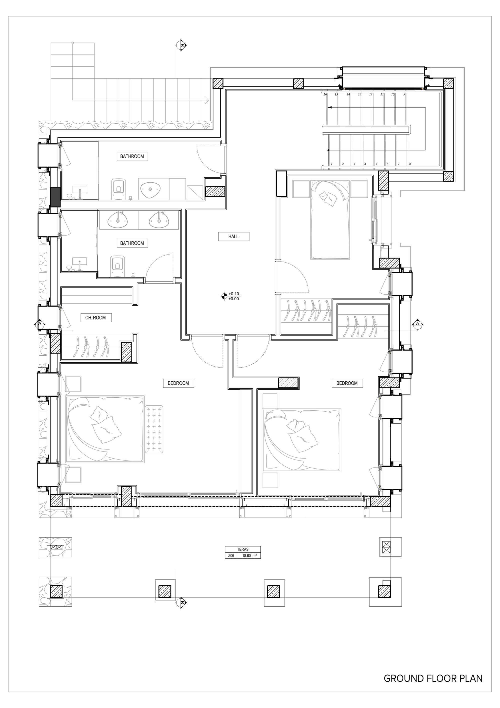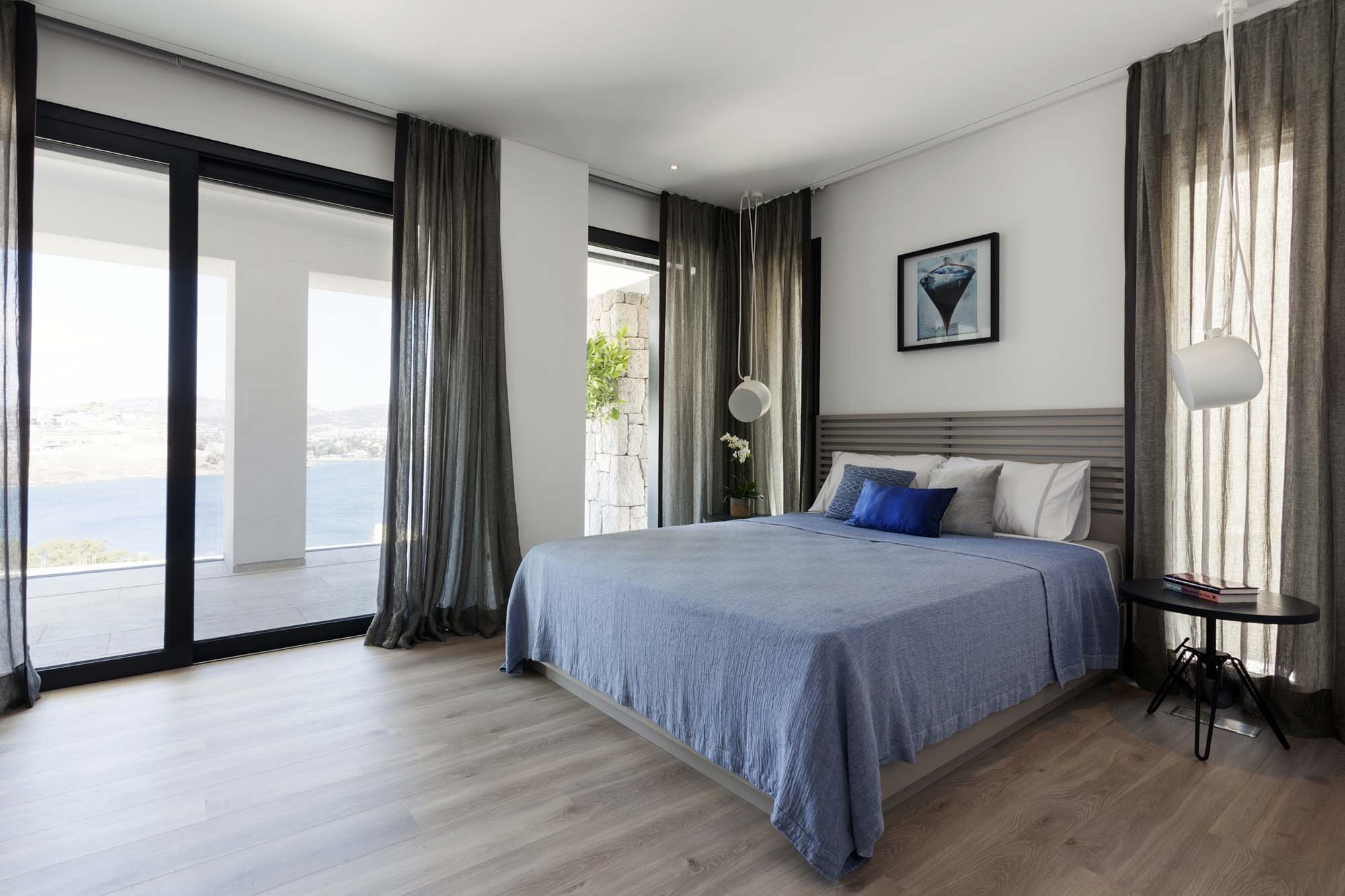The project, consisting of 13 buildings and 4 different types of housing, has ensured all the villas to have a unique view of the bay, by utilizing the vertical form of the land extending from the sea towards the slope. The design, remaining true to Bodrum’s well-known white colored architectural texture while skillfully applying Bodrum’s natural stones, has been constructed in cubic form structures in order to get the most out of the land. An additional feature of the design was to form a bond with the surrounding nature by restricting the use of natural stones solely in the base level and thus obtaining a two storey appearance of the three storey buildings. While achieving the widest possible uninterrupted view of the landscape through large openings in the front façades, narrow and long glass openings on the side façades are planned to break the mass effect of the cubic structure. At the same time, shadow variations of the different hours of the day were moved to the interior.